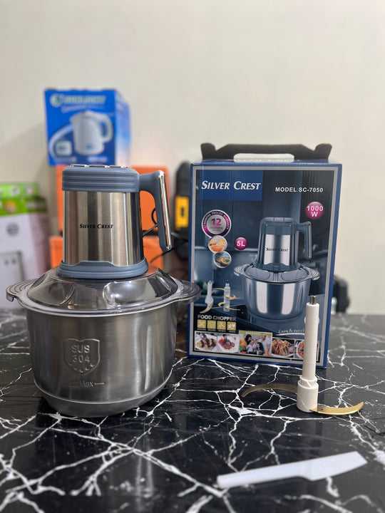 Meet the Silver Crest 5-Liter Double Blade Chopper, your efficient kitchen companion. Equipped with powerful double blades, this chopper offers dual cutting efficiency, making food processing faster and more convenient. Its spacious 5-liter capacity is perfect for chopping, dicing, and blending large quantities of vegetables, fruits, nuts, and more. Experience time-saving convenience in meal preparation while enjoying the durable construction for long-lasting performance. The chopper is also easy to clean with its detachable components, ensuring a hassle-free maintenance routine. Upgrade your kitchen with the Silver Crest Double Blade Chopper for efficient and versatile food processing.